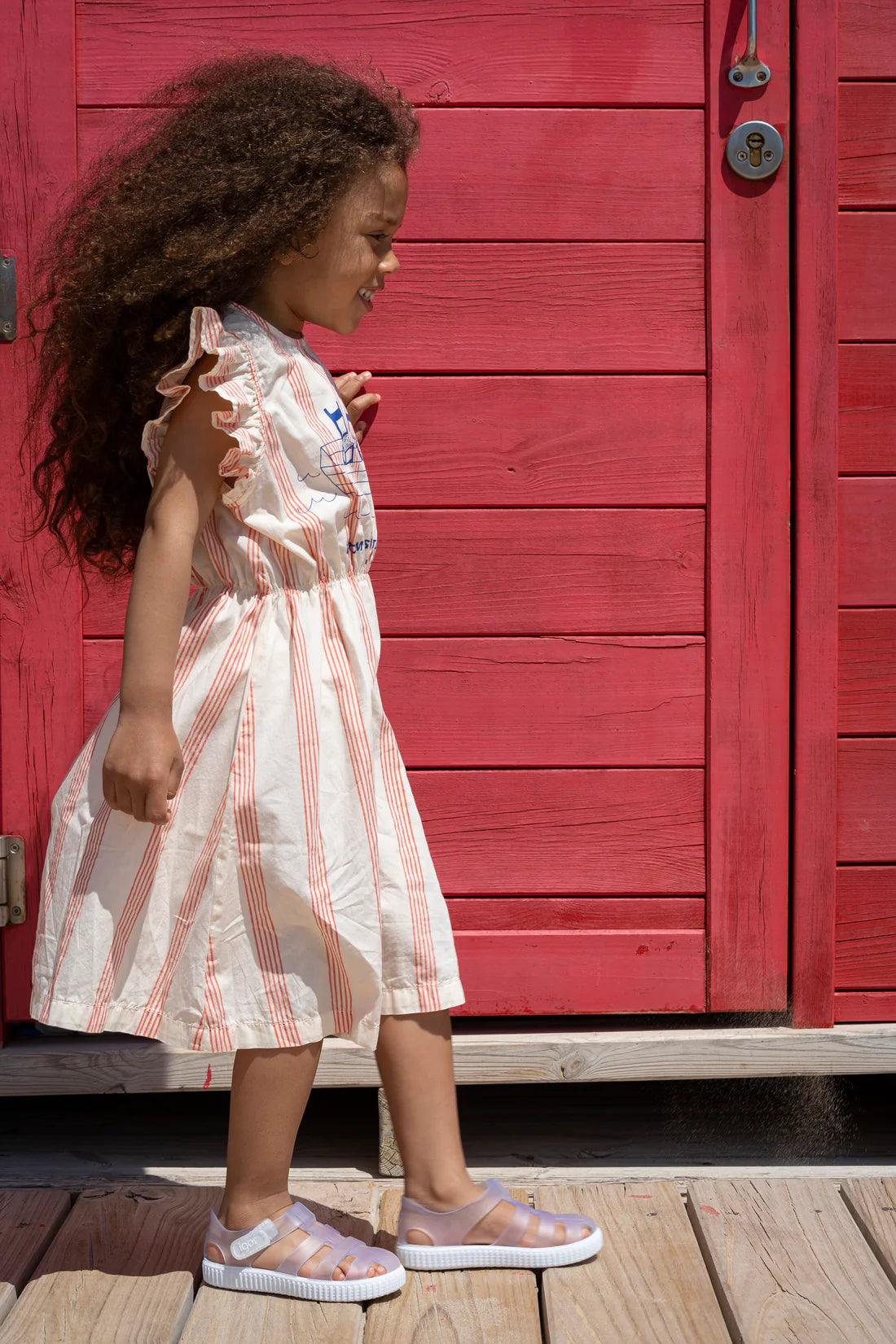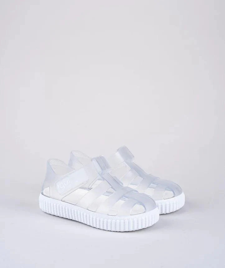 Caged jelly sandals from Igor with padded inner and white chunky sole. Branded velcro fastening. Perfect for days at the pool & the beach! In an on-trend claer/white colorway, perfect for boys and girls.