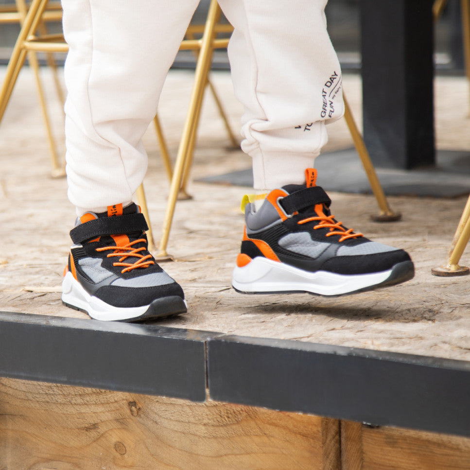 Gray/black/red high top sneakers with velcro closure.