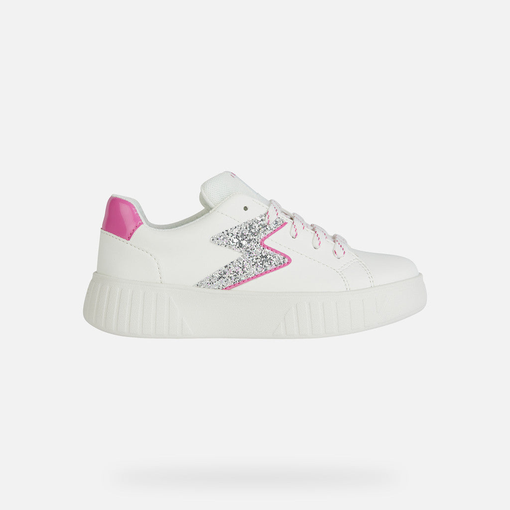 Feminine-looking sneaker for girls with a city-casual streetwear design. This white version with fuchsia-pink accents boasts a gleaming silver-tone detail on the upper which will elevate any everyday outfit with a glam touch. Mikiroshi is flexible, lightweight and breathable, and has been crafted from fabric, a glittery material and a leather-effect material.