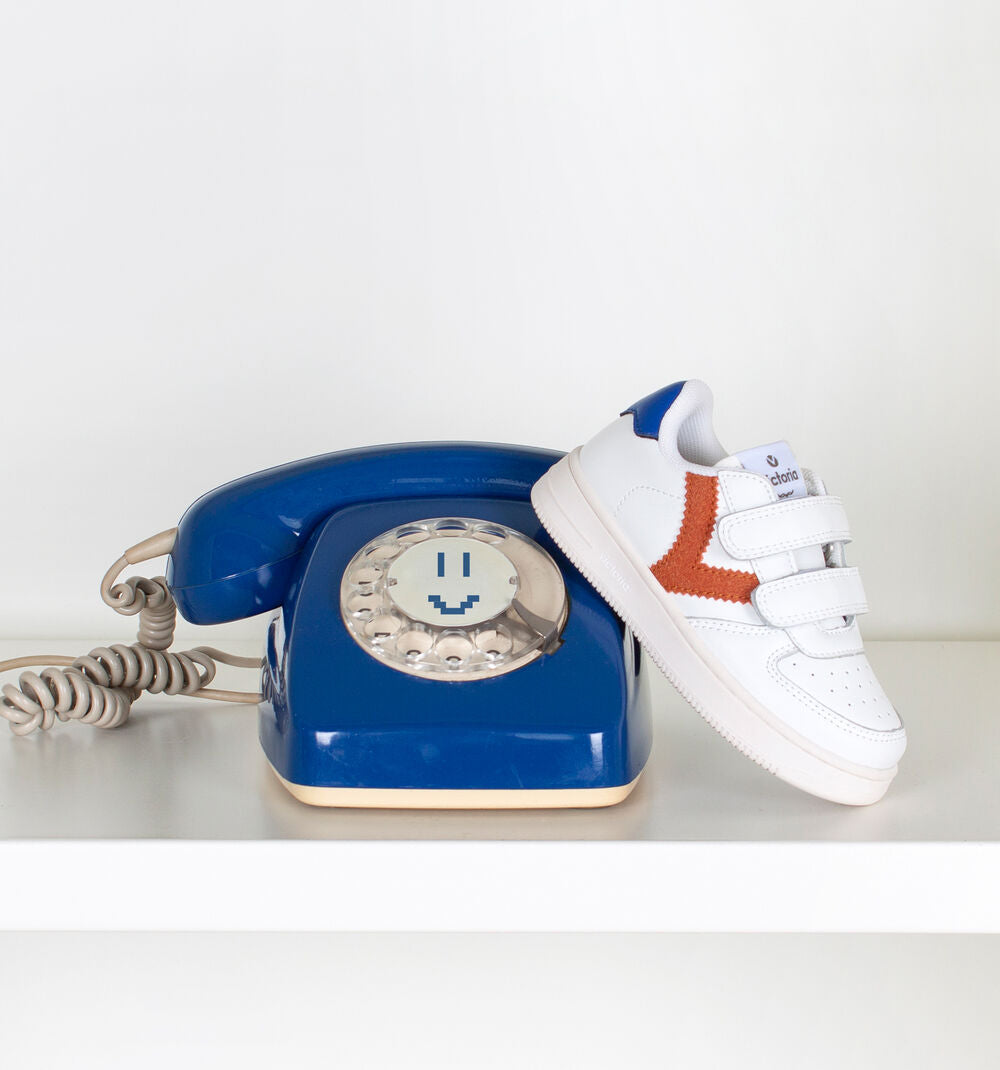 New white sneakers in leather effect material with contrasting brick red Victoria logo on the side and blue detail in the back. Double strap fastening, which makes them very comfortable to put on and take off as well as fitting perfectly to the foot.