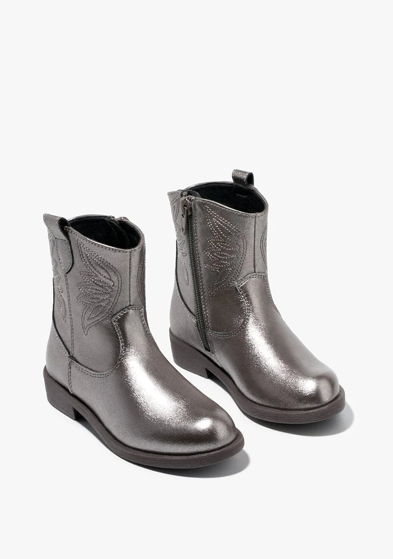 The cowboy ankle boots trend has arrived at Conguitos. These girls' ankle boots are made from pewter metallic material. They have embroidered details around the shaft. Worn effect toe cap. Pull tab in the same material and zip on the inside to make them easy to put on. Resistant rubber sole.
